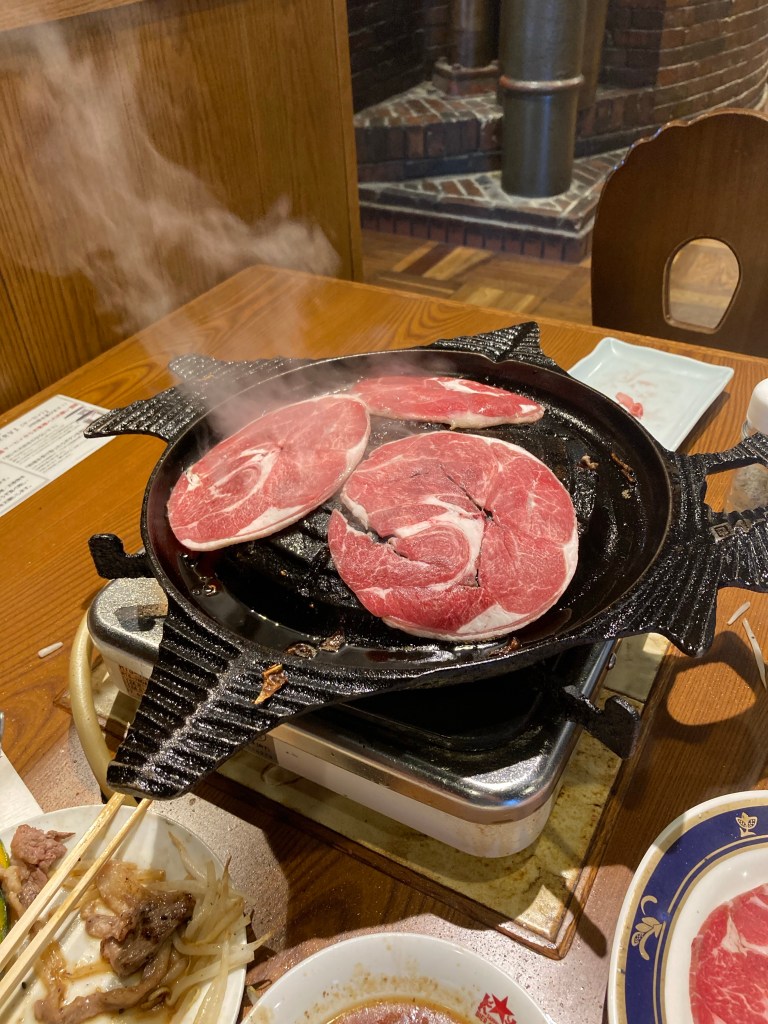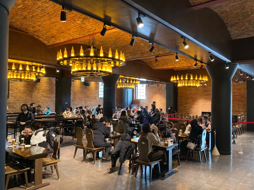 Adjacent to the museum is the Sapporo Biergarten which is a bit of a misnomer. Certainly there’s plenty of alcohol (all-you-can-drink for 90 minutes was an option), but the real star is the food. Lamb sizzled on a personal grill is known as the “Genghis Khan”, and just like the drinks you can get an all-you-care-to-eat special at reasonable cost. The constant smoky atmosphere lends an antique feel to the hall which surprisingly is undercut by the robotic staff; refills are brought to each table by a multistory Roomba.